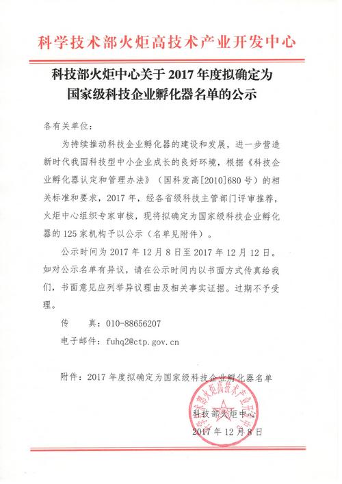 科技部火炬中心關于2017年度擬確定為國家級科技企業(yè)孵化器名單的公示