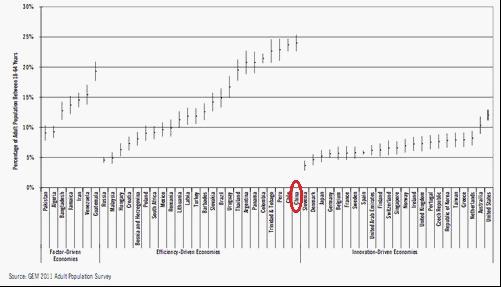 當然,不可忽視的一個背景是:在2011年,各國平均TEA指數均有所提高。“時勢造英雄”,在不利的經濟周期中,人們更傾向于以自身努力尋找發展機會,實現創業夢想,并抵抗下滑經濟周期帶來的沖擊。