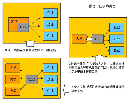 盡管目前由日本國家承認和認定的TLO已達51家,從組織形態上有財團法人、大學法人內組織、股份有限公司、有限責任公司等,但若按大學、TLO和企業之間的關系,大致可分為三種類型,即內部一體型、外部一體型和全方位型,如圖2所示。