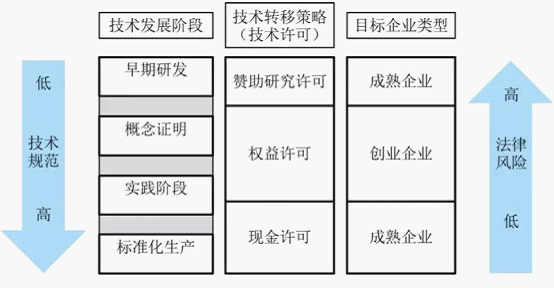 根據技術所處的發展階段不同,技術轉移所適用的策略也不同。技術的發展分成以下四個階段:早期研發、概念證明、試驗階段與標準化生產階段。其劃分依據是技術是否具備市場應用前景或是否足夠穩健,以應對知識產權法律糾紛。早期研發階段是指技術具有高度不確定的市場潛力和模糊的知識產權保護狀態;大規模重復驗證階段是指技術有清晰的市場應用前景并可享受強健的法律保護。