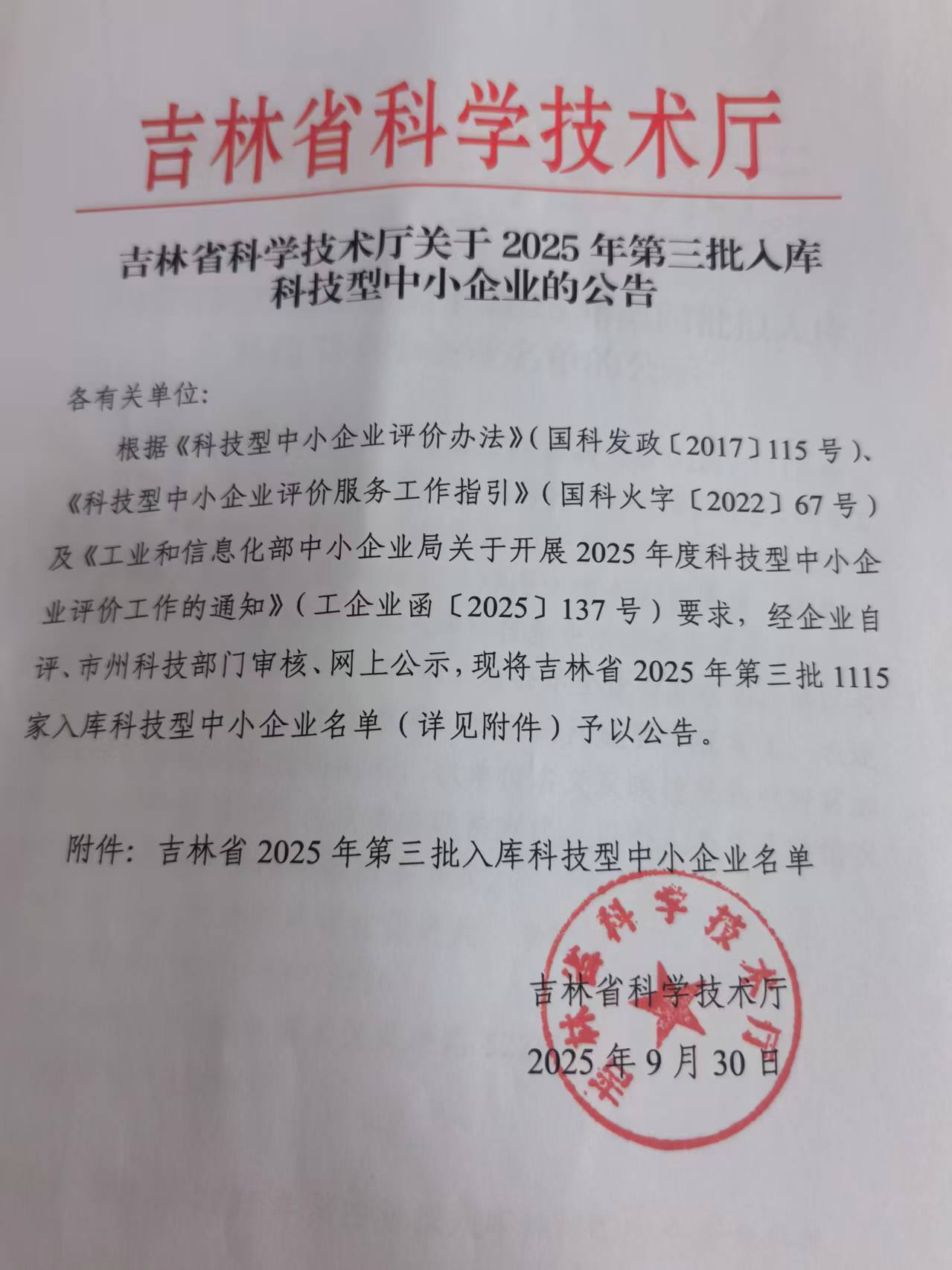 吉林省2025年第3批入庫科技型中小企業名單公告