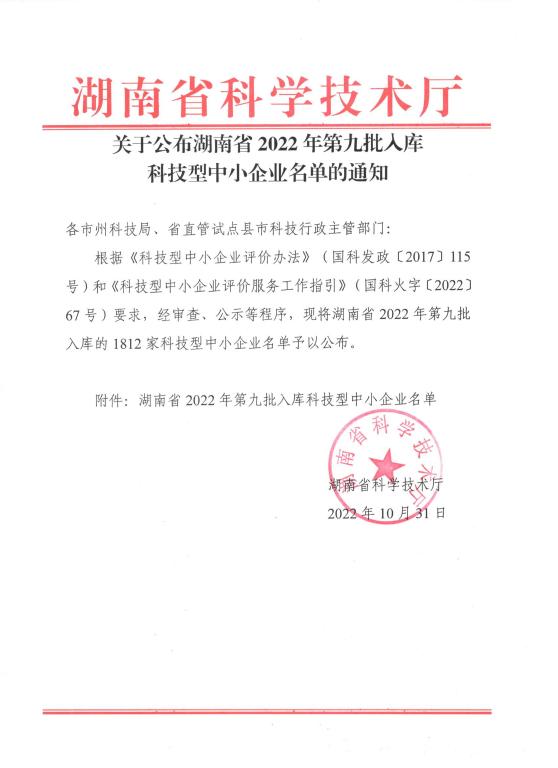湖南省2022年第9批入庫科技型中小企業名單公告