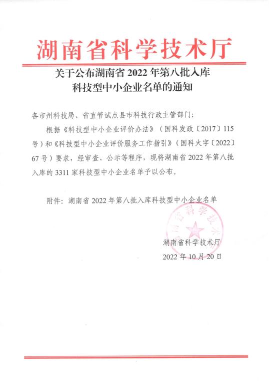 湖南省2022年第8批入庫科技型中小企業(yè)名單公告