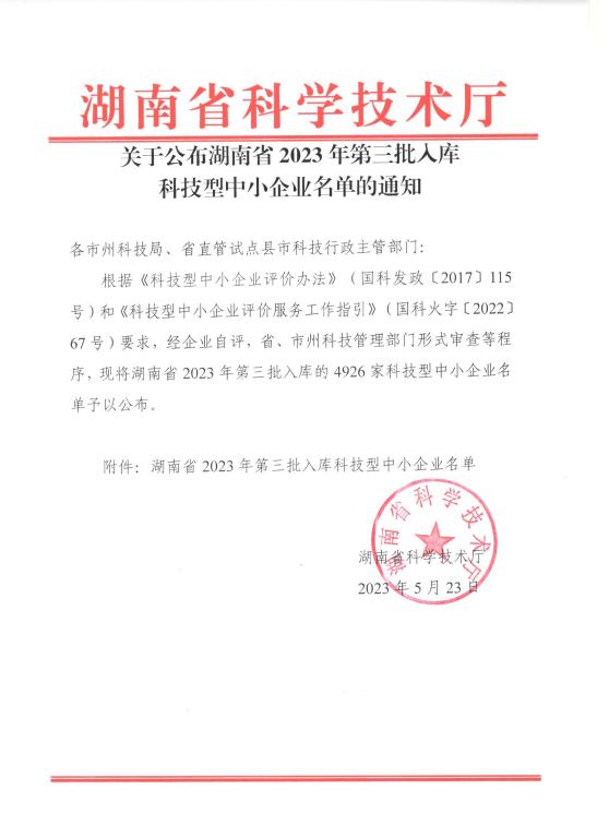 湖南省2023年第3批入庫科技型中小企業(yè)名單公告