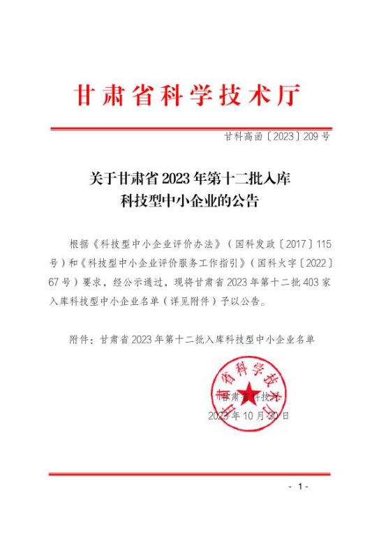 甘肅省2023年第12批入庫科技型中小企業名單公告
