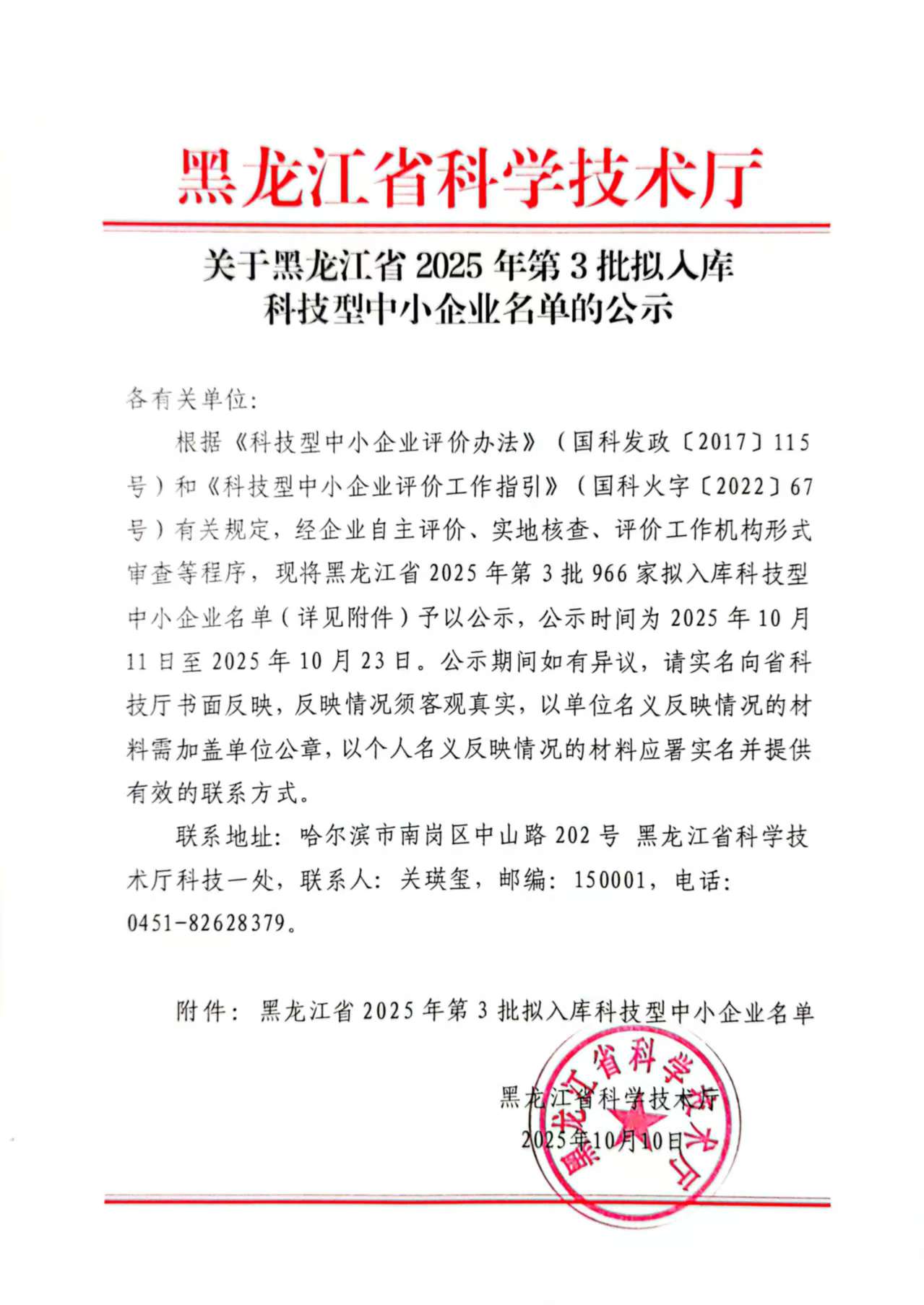 黑龍江省2025年第3批擬入庫科技型中小企業名單公示