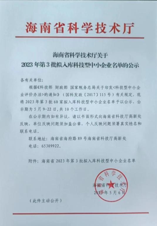 海南省2023年第3批擬入庫科技型中小企業名單公示