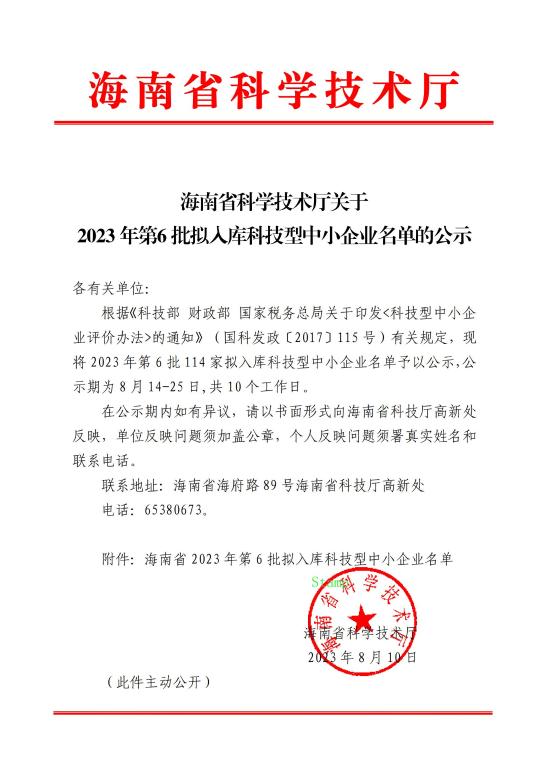 海南省2023年第6批擬入庫科技型中小企業名單公示
