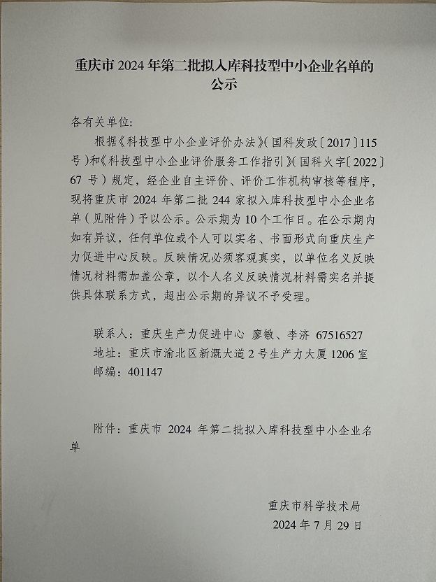重慶市2024年第2批擬入庫科技型中小企業名單公示