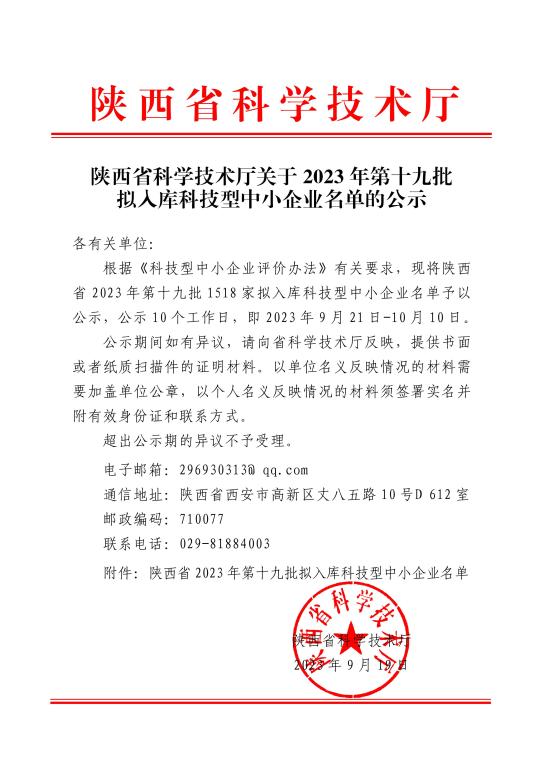 陜西省2023年第19批擬入庫科技型中小企業名單公示