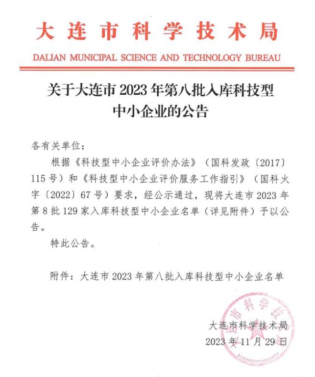 大連市2023年第8批入庫科技型中小企業(yè)名單公告