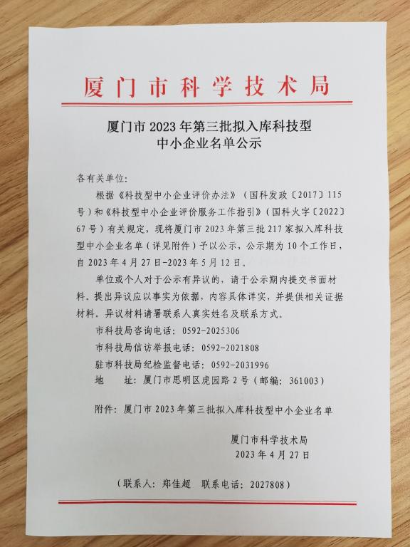 廈門市2023年第3批擬入庫科技型中小企業(yè)名單公示